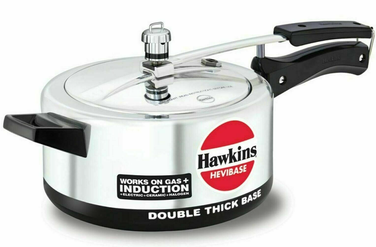 The Hawkins Hevibase pressure cooker made of commercially available pure aluminum is induction compatible with an external base plate made of Aisi 430 grade magnetic stainless steel, which is attached to the double-thick base. It can be used safely on all household gas, electric, halogen, ceramic and induction hobs. The double-thick, heavy base is ideal for lightly frying before pressure cooking. The base stays flat, never bulges. Suitable for gas, electric, ceramic and halogen hobs. A version of this model with a fully hard anodized, double-thickness base was available as the Hawkins Ecobase. This was suitable for household gas, electricity, halogen, ceramics, but not induction hobs. This product is no longer available in certain markets.