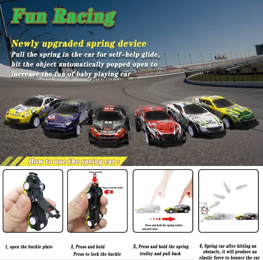 This toy cars for 3+ year old boys set includes a larger delivery truck and 6 alloy mini project cars, 6 mini spring racing cars. Toys for toddler boys 3-5 years old. The fun slide on the front of the car and the new upgraded spring mini racing cars will be more appealing to kids, this would be a great birthday/Christmas/party/holiday gift for boys 3-6 years old.